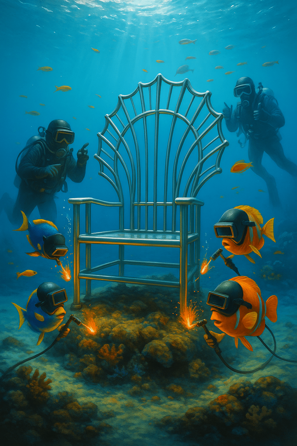 🦜🐟 Pablo the Parrotfish – He wears a big welding helmet and is always grinning. Pablo fuses metal pieces with fiery flair. He’s bright, bold, and believes that underwater art should be as fun as a coral conga line.